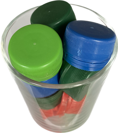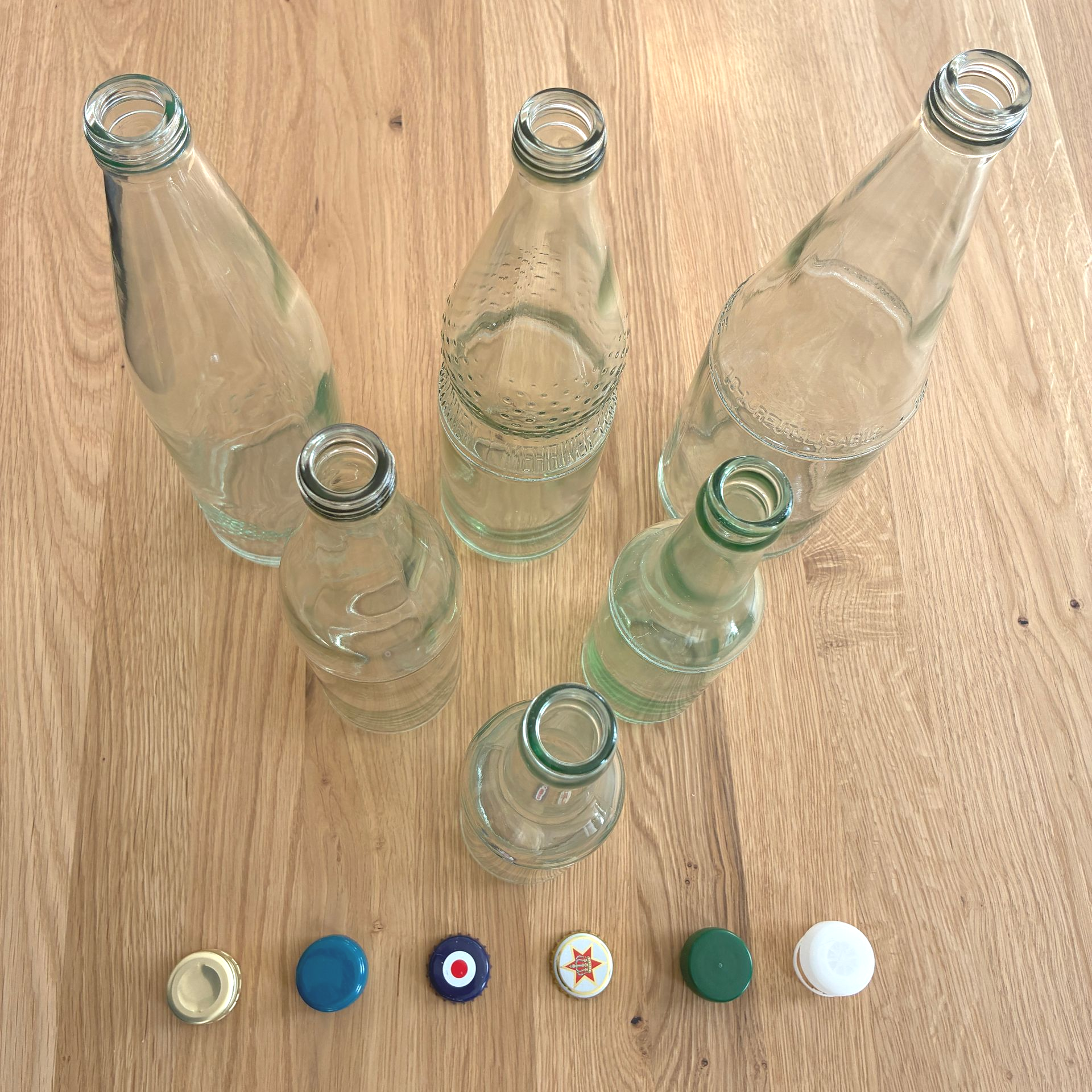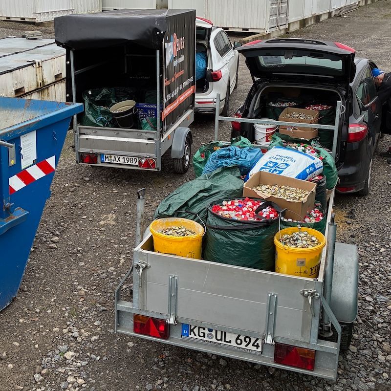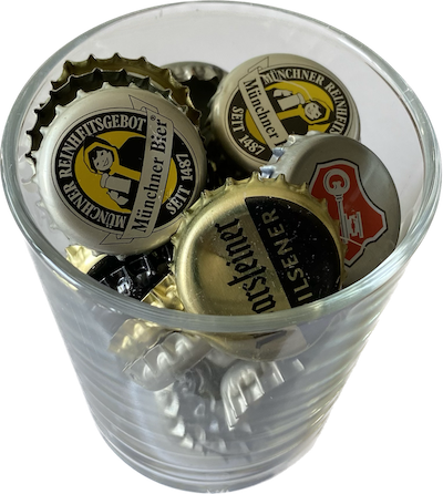 Kronkorken und Drehverschlüsse getrennt sammeln.